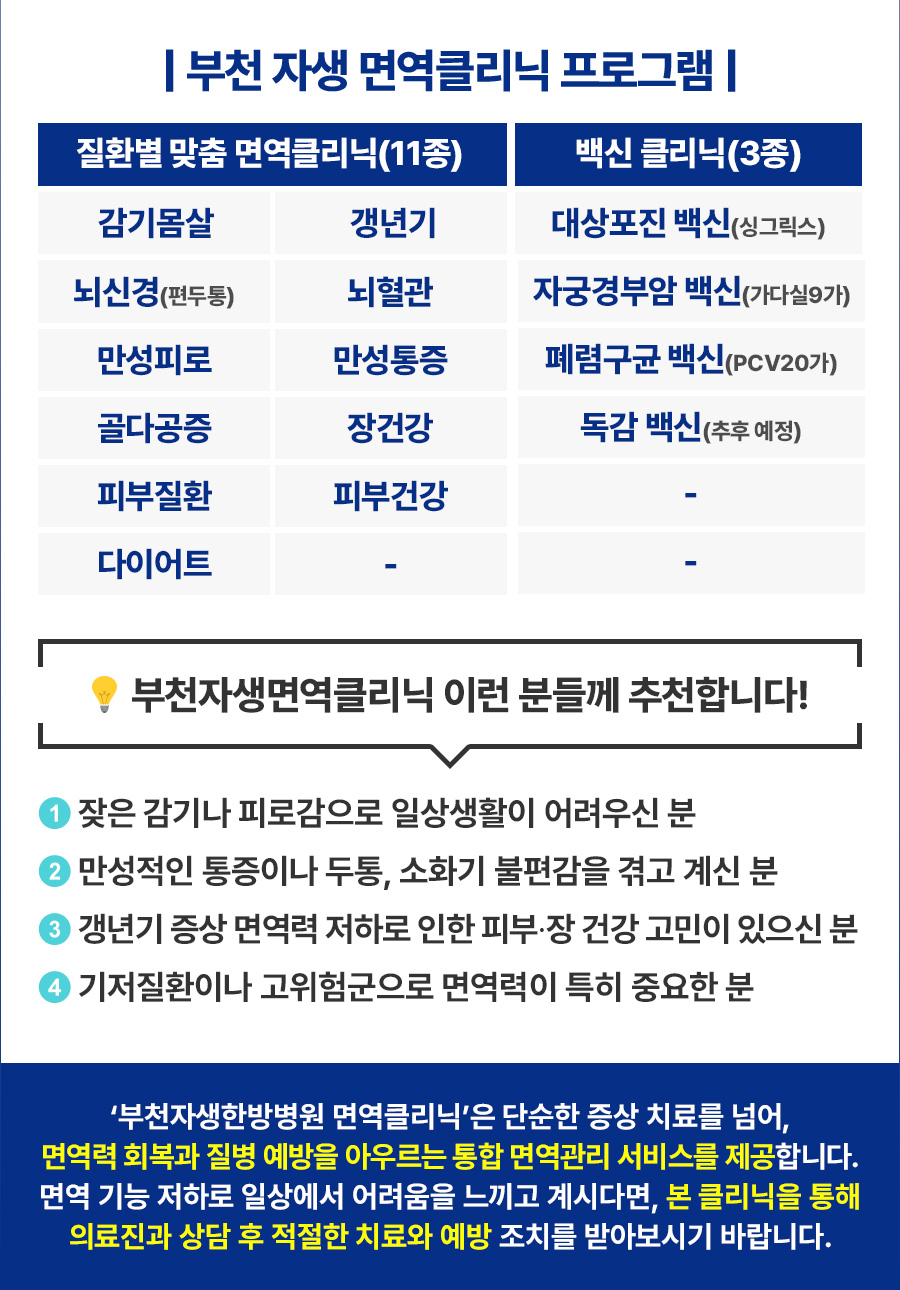 부천 자생 면역클리닉 프로그램 / 질환별 맞춤 면역클리닉(11종) 감기몸살, 갱년기, 뇌신경(편두통), 뇌혈관, 만성피로, 만성통증, 골다공증, 장건강, 피부질환, 피부건강 다이어트/ 백신 클리닉(3종) 대상포진 백신(싱그릭스), 자궁경부암 백신(가다실9가), 폐렴구균 백신(pcv20가), 독감 백신(추후 예정) / 부천자생면역클리닉 이런 분들께 추천합니다! 1 잦은 감기나 피로감으로 일상생활이 어려우신 분 / 2 만성적인 통증이나 두통, 소화기 불편감을 겪고 계신 분 / 3 갱년기 증상 면역력 저하로 인한 피부.장 건강 고민이 있으신 분 / 4 기저질환이나 고위험군으로 면역력이 특히 중요한 분 / ‘부천자생한방병원 면역클리닉’은 단순한 증상 치료를 넘어, 면역력 회복과 질병 예방을 아우르는 통합 면역관리 서비스를 제공합니다. 면역 기능 저하로 일상에서 어려움을 느끼고 계시다면, 본 클리닉을 통해 의료진과 상담 후 적절한 치료와 예방 조치를 받아보시기 바랍니다.