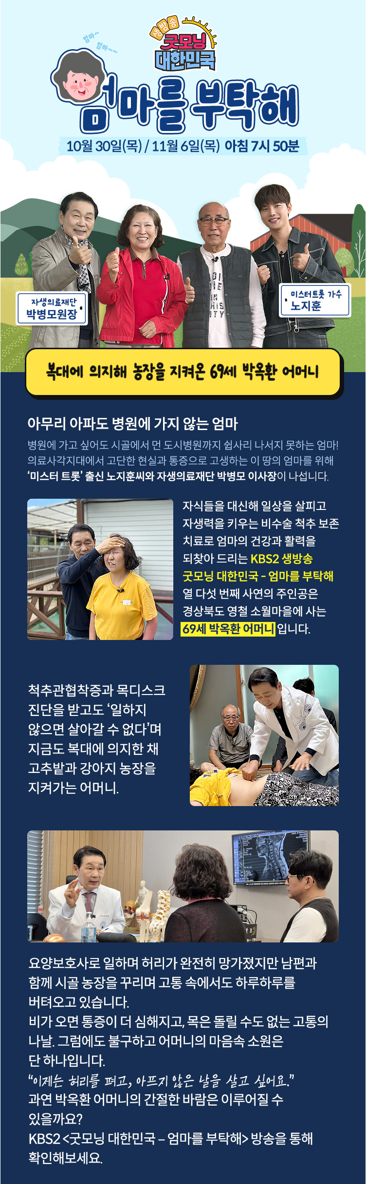 KBS 방송안내 / KBS2 생방송 굿모닝 대한민국 - 엄마를 부탁해 / 방송일 10.30(목), 11.6(목) am 7:50~ / 복대에 의지해 농장을 지켜온 69세 박옥환 어머니 / 아무리 아파도 병원에 가지 못하는 엄마. 병원에 가고 싶어도 시골에서 도시 병원까지 가는 길이 멀고 쉽지 않은 엄마. 의료 사각지대에서 고단한 현실과 통증 속에 살아가는 이 땅의 엄마들을 위해 ‘미스터트롯’ 출신 가수 노지훈 씨와 자생의료재단 박병모 이사장이 함께합니다. 자식들을 대신해 일상을 살피고, 자생력을 키우는 비수술 척추 치료로 엄마의 건강과 활력을 되찾아 드리는 KBS2 생방송 <굿모닝 대한민국 – 엄마를 부탁해> 열 다섯 번째 사연의 주인공은경상북도 영천 소일마을에 사는 69세 박옥환 어머니입니다. 척추관협착증과 목디스크 진단을 받고도 “일하지 않으면 살아갈 수 없다”며 지금도 복대에 의지한 채 고추밭과 강아지 농장을 지켜가는 어머니. 요양보호사로 일하며 허리가 완전히 망가졌지만 남편과 함께 시골 농장을 꾸리며 고통 속에서도 하루하루를 버텨오고 있습니다. 비가 오면 통증이 더 심해지고, 목은 돌릴 수도 없는 고통의 나날. 그럼에도 불구하고 어머니의 마음속 소원은 단 하나입니다. “이제는 허리를 펴고, 아프지 않은 날을 살고 싶어요.” 과연 박옥환 어머니의 간절한 바람은 이루어질 수 있을까요? KBS2 <굿모닝 대한민국 – 엄마를 부탁해> 방송을 통해 확인해보세요.